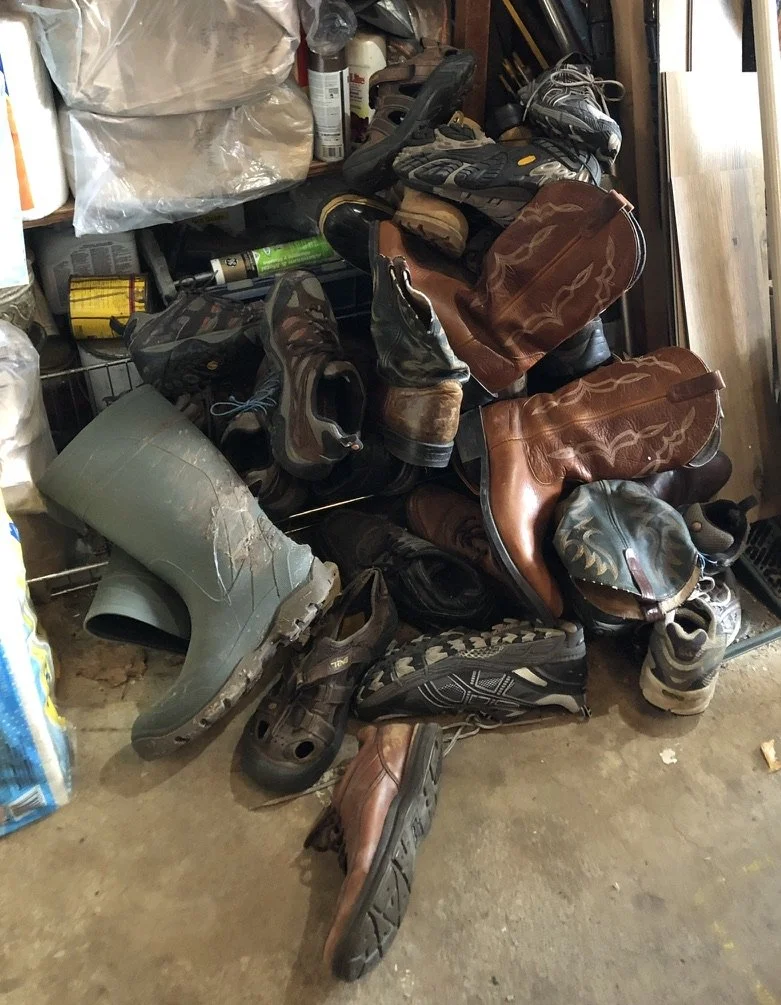 After decades of training, he now kicks off his shoes before entering the house. Usually at the base of the step-up to the door, where they’re a hazard when stepping down until I toss them to the left onto his three-foot mound of cowboy boots, sandals, loafers, and running shoes. My shoes are lined up on the right—one pair of wellies, one pair of snow boots, one pair of all-weather mocs, my house slippers and the pair I wear to work.